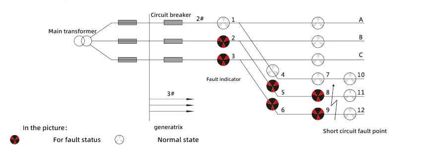 Με βάση τα χαρακτηριστικά των σφαλμάτων βραχυκυκλώματος, το κριτήριο δράσης είναι η απότομη αλλαγή του ρεύματος που συνοδεύεται από διακοπή ρεύματος της διάταξης προστασίας. Η λογική ερμηνείας του διαγράμματος ένδειξης σφάλματος είναι η εξής: εάν οι ενδείξεις 2, 5 και 8 της φάσης Α και οι ενδείξεις 3, 6 και 9 της φάσης Γ της γραμμής 2 γίνουν όλες κόκκινες, ενώ οι ενδείξεις 11 και 12 παραμένουν λευκές, τότε μπορεί να προσδιοριστεί ότι έχει συμβεί σφάλμα βραχυκυκλώματος σε αυτό το σημείο εξερχόμενης γραμμής.